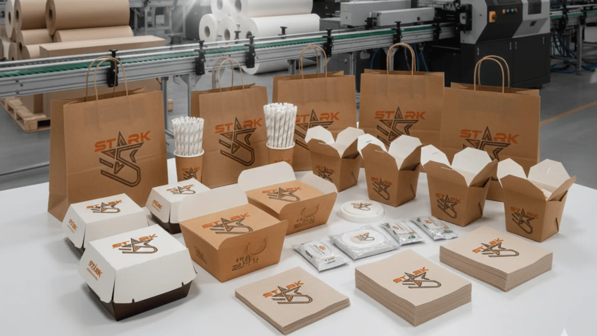 Stark Verpackung GmbH, modern üretim altyapısı ve sektör deneyimiyle; restoranlar, zincir markalar ve catering firmaları için kâğıt bazlı ambalaj ürünleri üretir.